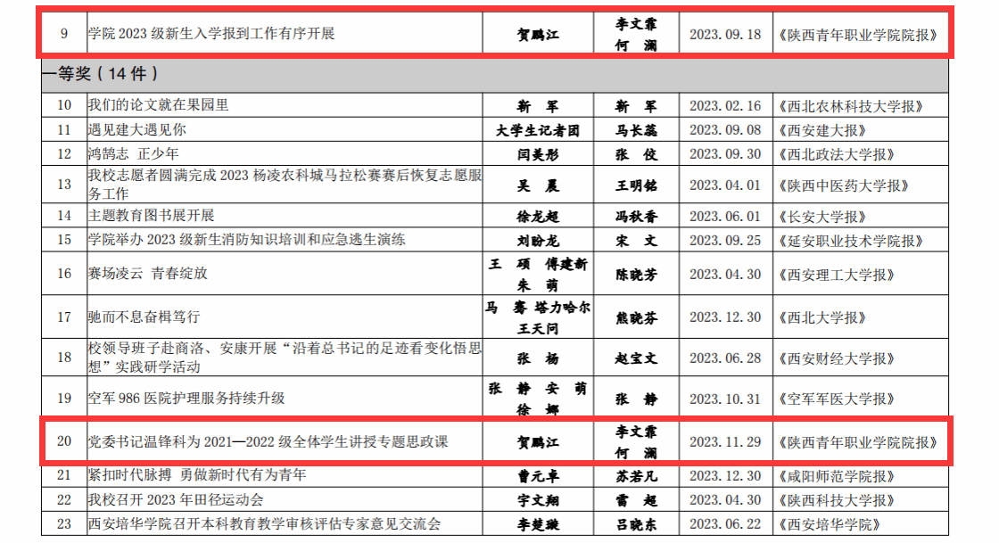 近期,陕西省高校校报研究会公布了2023年度“陕西高校新闻奖”评选结果,我院3件新闻作品分别获特等奖、一等奖、二等奖。