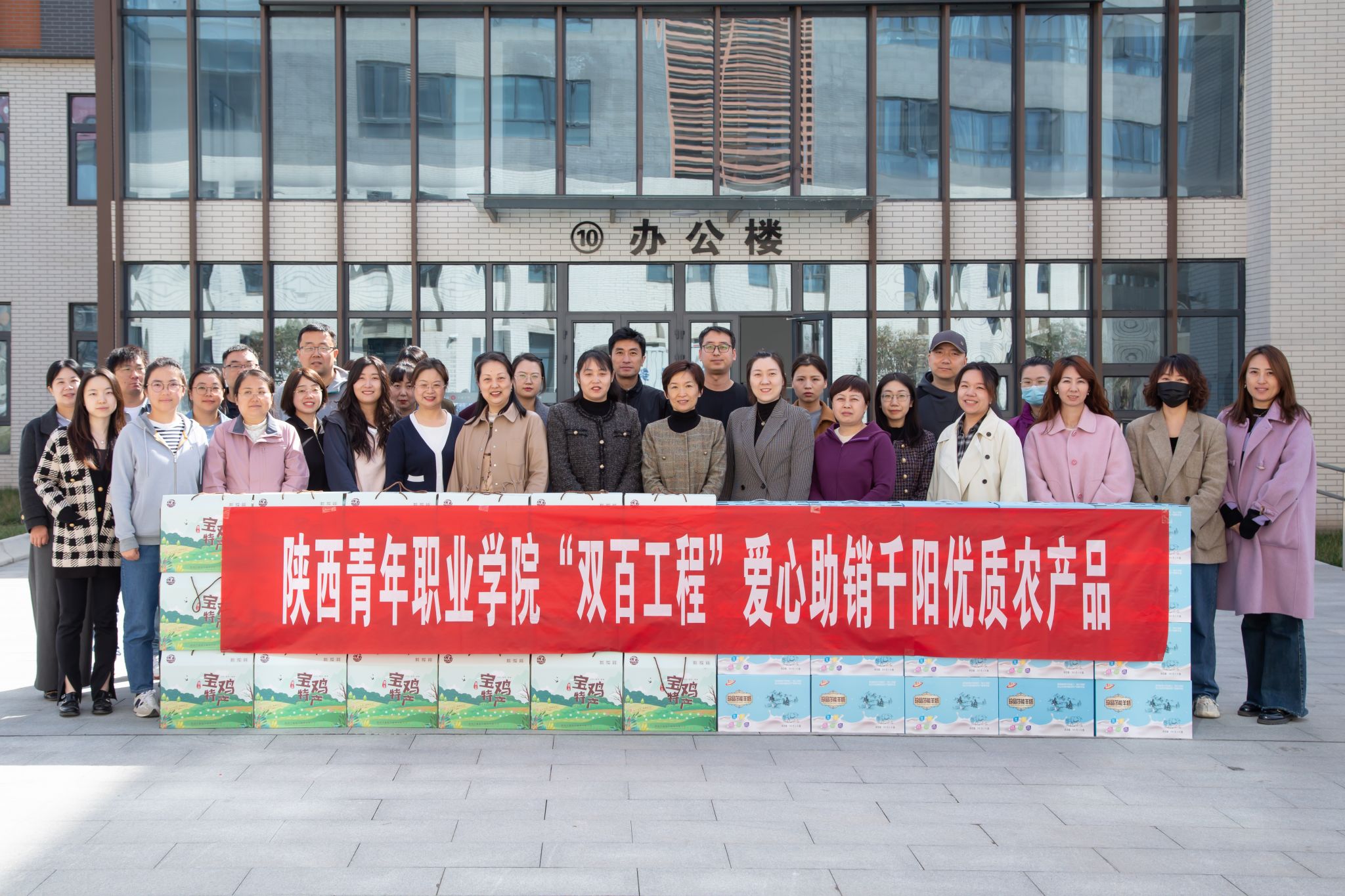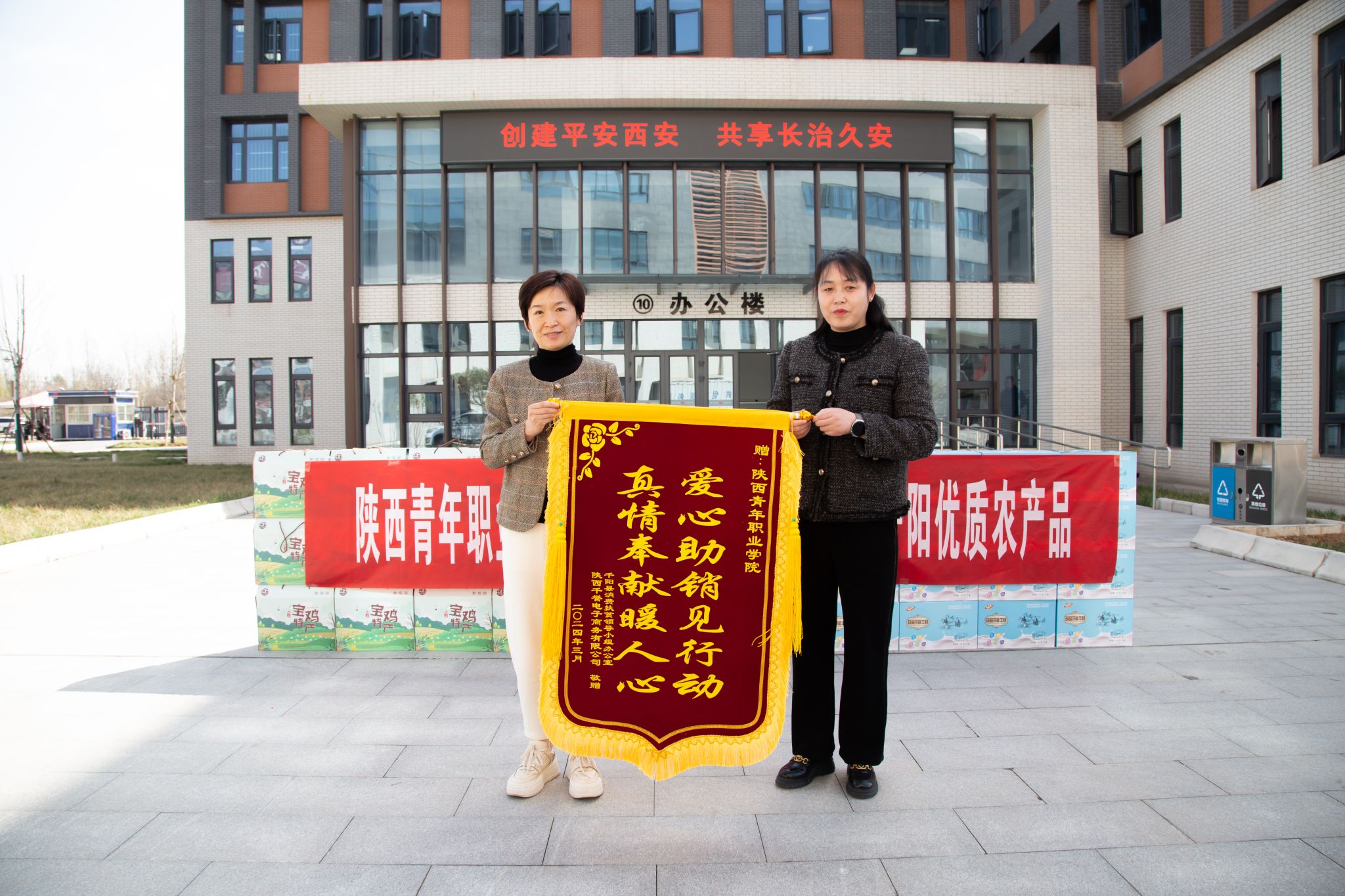 3月28日,学院在长安校区举行2024年“双百工程”消费帮扶优质农产品进校园活动。为感谢学院在“双百工程”工作中对千阳县消费帮扶工作的大力支持,千阳千誉电子商务有限公司经理蒲丽以“爱心助销见行动 真情奉献暖人心”向学院赠送锦旗,校(院)党委副书记梁菀华代表学院接受锦旗。