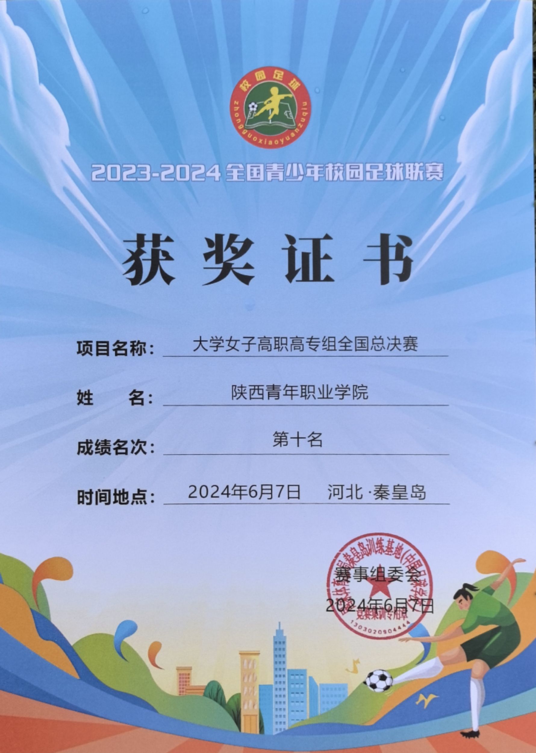 5月29日至6月7日,由教育部主办、中国学生体育联合会执行、中国学生体育联合会高职院校工作委员会协办,国家体育总局秦皇岛训练基地(中国足球学校)承办的2023-2024全国青少年校园足球联赛大学女子高职高专组全国总决赛在秦皇岛基地举行。我院女子足球队作为陕西高职院校组冠军队,在教练孙晋、张强、史利带领下代表陕西参赛,得到了学院的大力支持,赛况引发了全院师生的关注。