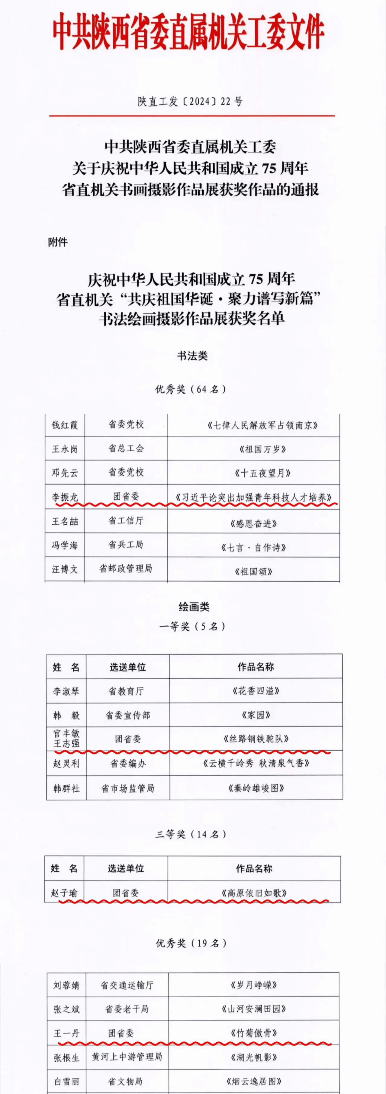近期,省直机关举办庆祝中华人民共和国成立75周年“共庆祖国华诞 聚力谱写新篇”书法绘画摄影作品展活动结果揭晓。sjb世俱杯精心选送书画摄影作品参与展评活动,获得多个奖项。其中绘画类:宫丰敏作品《丝路钢铁驼队》获一等奖,赵子瑜作品《高原依旧如歌》获三等奖,王一丹作品《竹菊傲骨》获优秀奖;书法类:李振龙作品《习近平论突出加强青年科技人才培养》获优秀奖。
