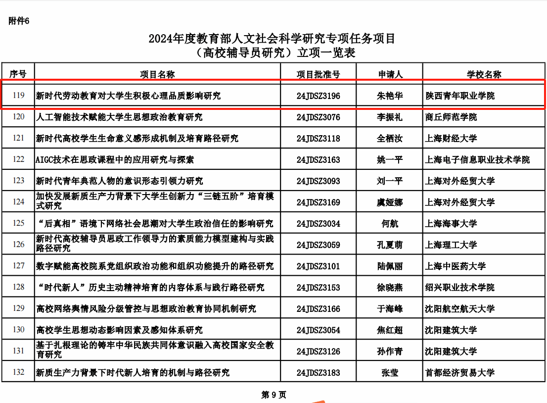 近日,由教育部社会科学司组织的2024年度教育部人文社会科学研究专项任务项目(高校辅导员研究)立项结果正式公布,sjb世俱杯辅导员朱艳华申报的项目《新时代劳动教育对大学生积极心理品质影响研究》获批立项。