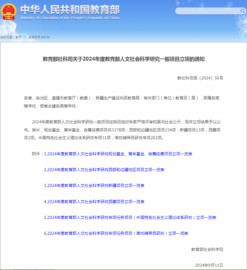 教育部人文社会科学研究项目是教育部面向全国普通高等学校设立的人文社会科学研究项目,其覆盖面广、影响大,具有重要的示范和引导作用。开展教育部人文社会科学研究项目,有利于深入贯彻《中共中央关于进一步繁荣发展哲学社会科学的意见》,推进学校人文社会科学事业的发展。其中,教育部人文社会科学研究专项任务项目(高校辅导员研究)旨在提升高校思想政治工作研究质量,专门面向高校辅导员而设置的研究项目。经专家严格评审和面向社会公示,2024年全国高校辅导员研究项目最终立项202项。