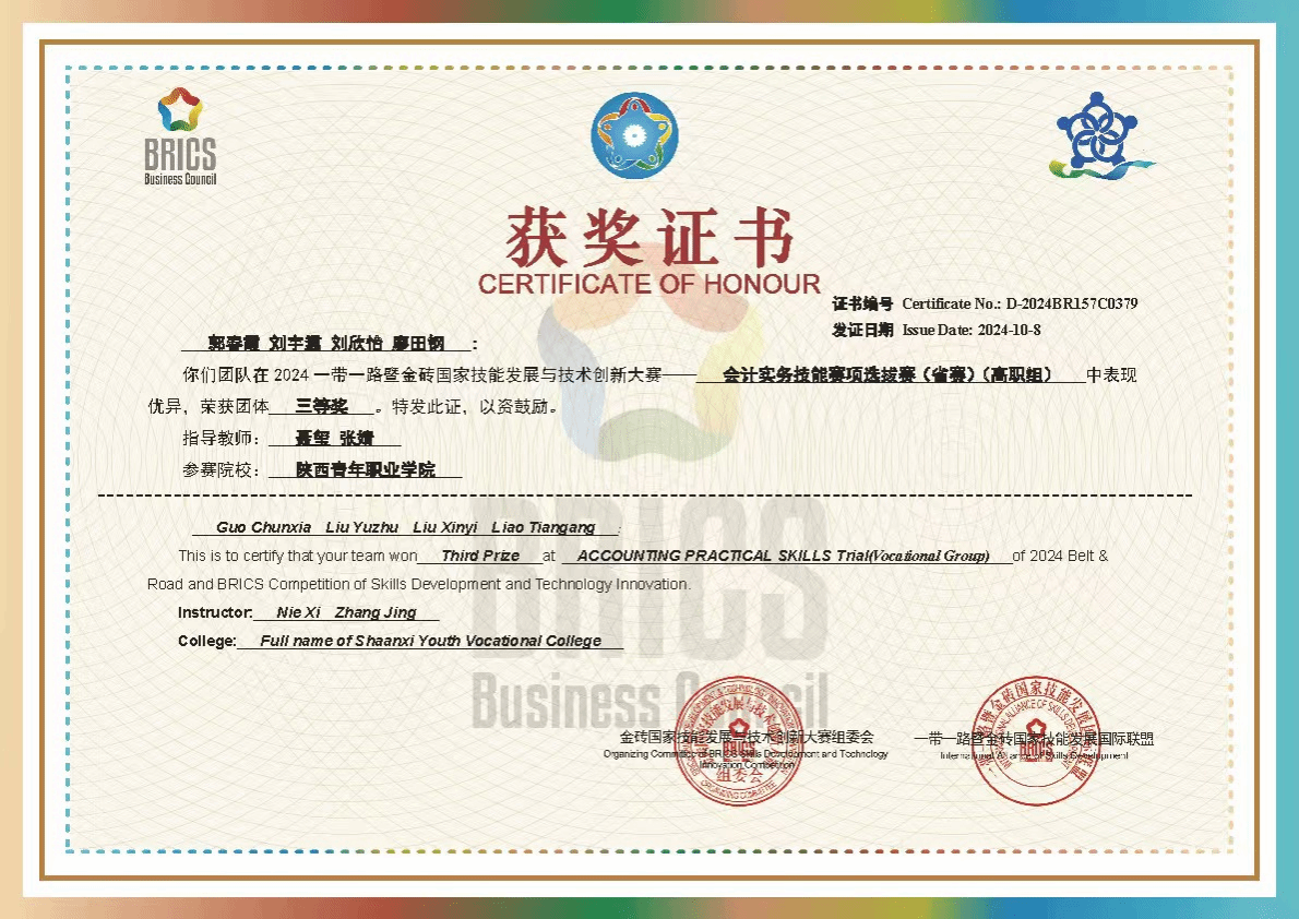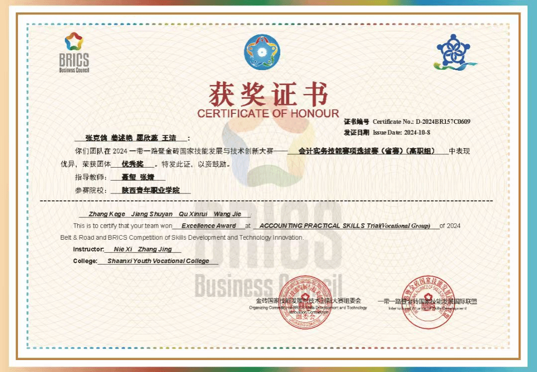 近日,2024一带一路暨金砖国家技能发展与技术创新大赛“会计实务”技能赛项(高职组)竞赛结果出炉,sjb世俱杯数字经济与数字技术系2022级、2023级大数据与会计专业学生刘欣怡、刘宇翥、郭春霞、廖田钢、张克鸽、姜述艳、屈欣蕊、王洁等八位同学组成的两支参赛队伍,在聂玺、张婧两位老师的指导下,经过近两个月的紧张备赛,最终斩获三等奖和优秀奖。