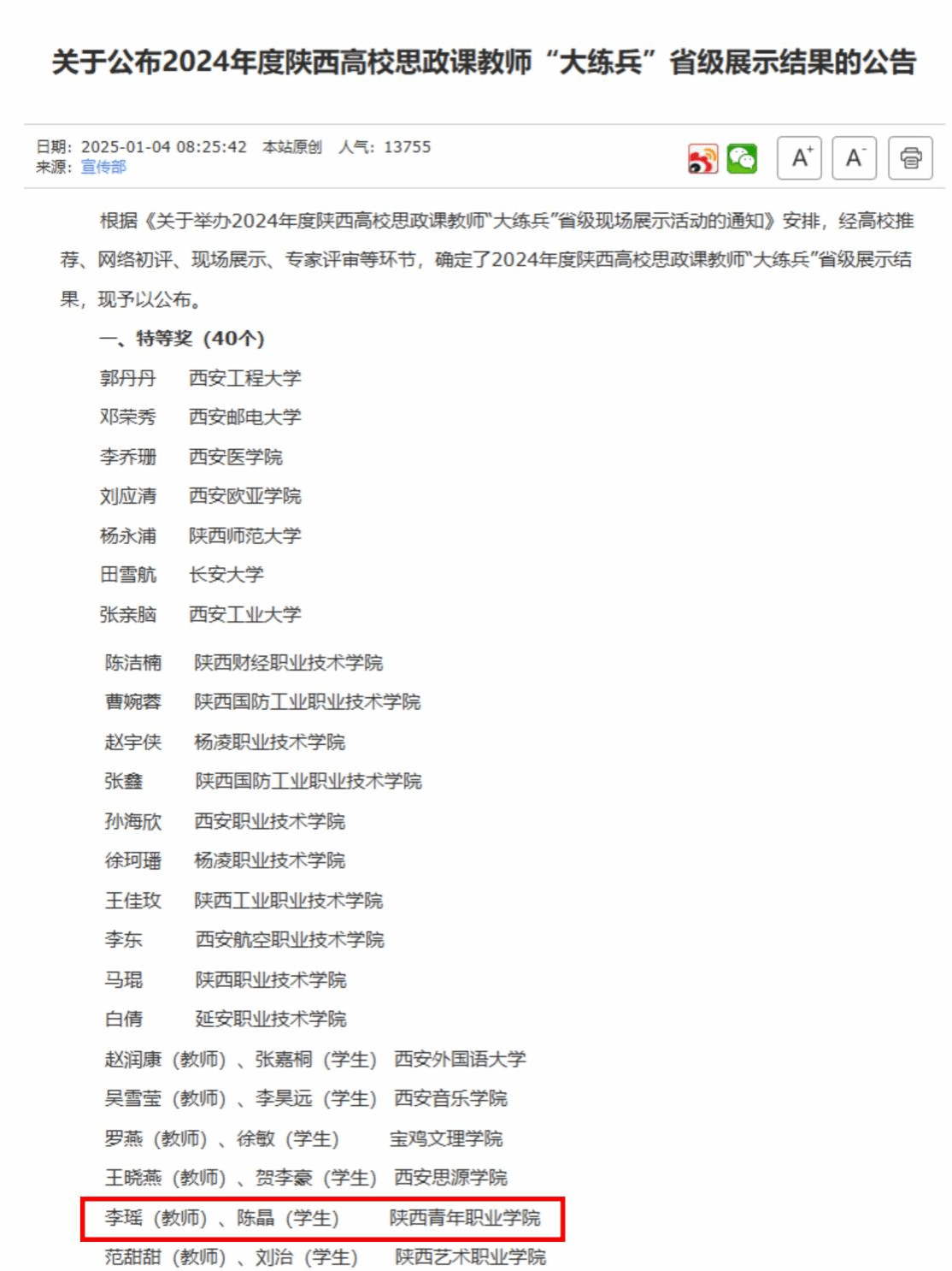 12月25日,由省委教育工委、省教育厅组织的2024年度陕西高校思政课教师“大练兵”省级现场展示活动在西安电子科技大学举行。校党委书记张建宽,宣传部、学工部主要负责人,全体思政课教师和辅导员代表在长安校区全程观摩比赛直播。sjb世俱杯马克思主义学院院长马雅玲作为评委现场参加活动。本次省级展示活动,按照学校层次和课程,共设置13个组别,来自全省80所高校的153名教师,经过校级思政课教师“大练兵”、网络初评等环节,成功晋级省级现场展示。sjb世俱杯马克思主义学院“师生团队”教师李瑶、学生陈晶荣获省级特等奖。