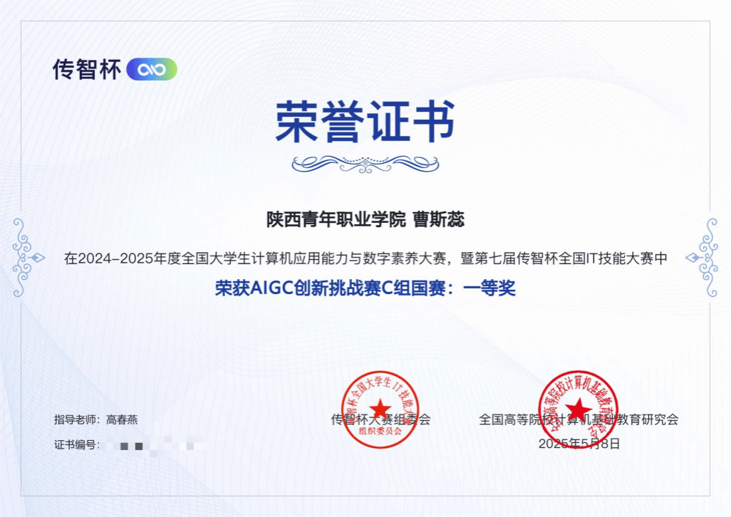 近期,2024-2025年度全国大学生计算机应用能力与数字素养大赛暨第七届“传智杯”全国IT技能大赛总决赛落幕。经过全国上万支队伍激烈角逐,由高春燕、张彤芳两位老师指导的大数据技术专业的怀蝶忆寒团队凭借“智慧养老Agent平台”荣获Web开发赛道一等奖,人工智能专业学生曹斯蕊在AIGC赛道中摘得桂冠。
