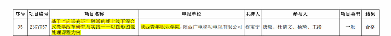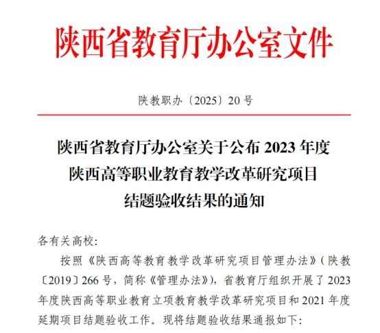 近日,根据《陕西省教育厅办公室关于公布2023 年度陕西高等职业教育教学改革研究项目结题验收结果的通知》(陕教职办〔2025〕20 号),sjb世俱杯穆宝宁老师主持的《基于“岗课赛证”融通的线上线下混合式教学改革研究与实践-以图形图像处理课程为例》(23GY057)项目顺利通过结题验收。