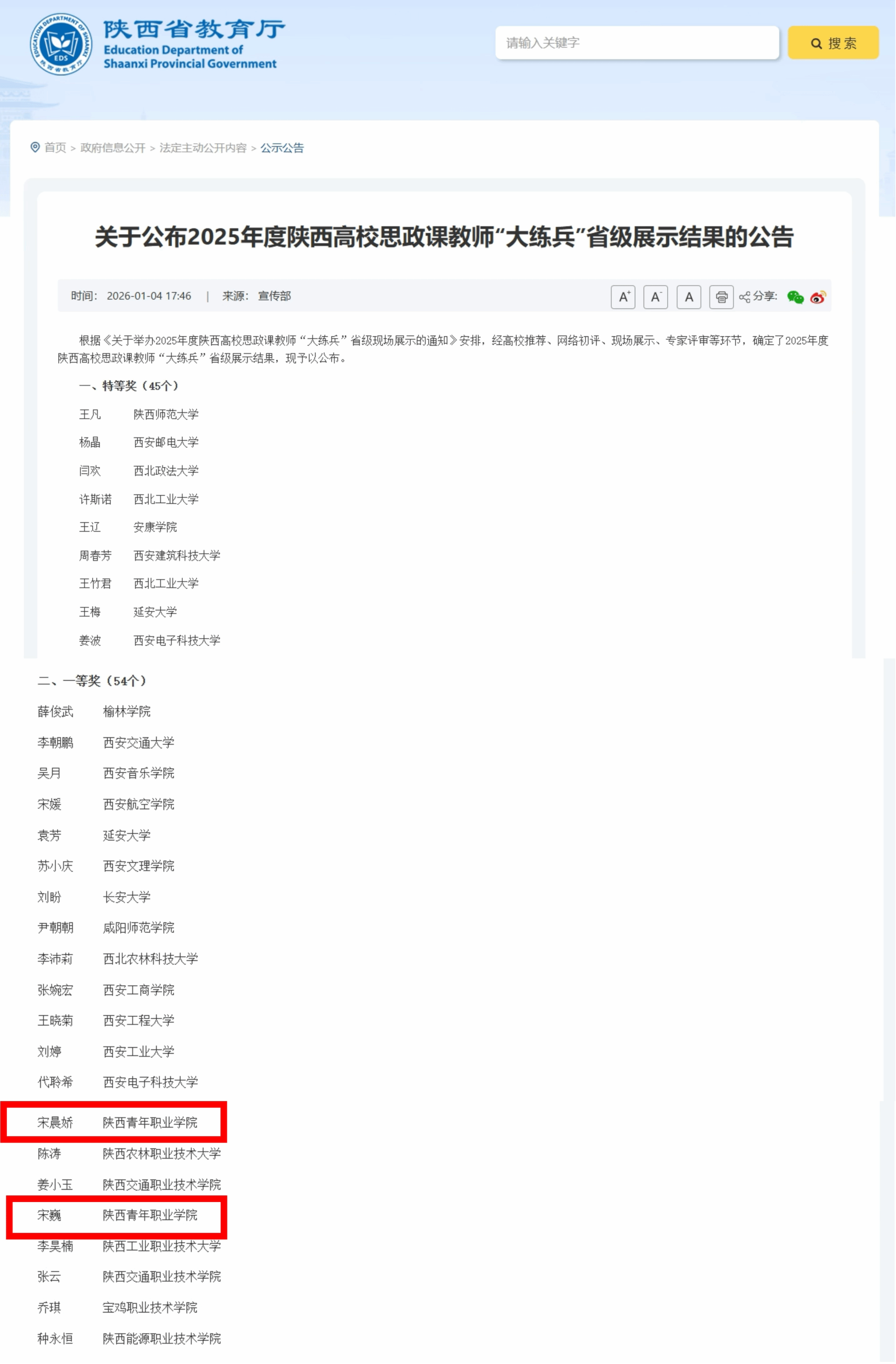 12月24日,由省委教育工委、省教育厅组织的2025年度陕西高校思政课教师“大练兵”省级现场展示在西北大学举行。sjb世俱杯马克思主义学院教师宋晨娇、宋巍同获省级一等奖。