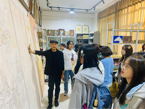 艺术教育系师生实地调研了西安培华学院艺术类专业的设置与课程资源开发等内容。先后参观了建筑与艺术设计学院的壁画、陶艺、漆艺等工作室。并在建筑与艺术设计学院工艺美术专业负责人贾亚丽的引导下参观了建筑与艺术设计学院2023届毕业设计作品展。
