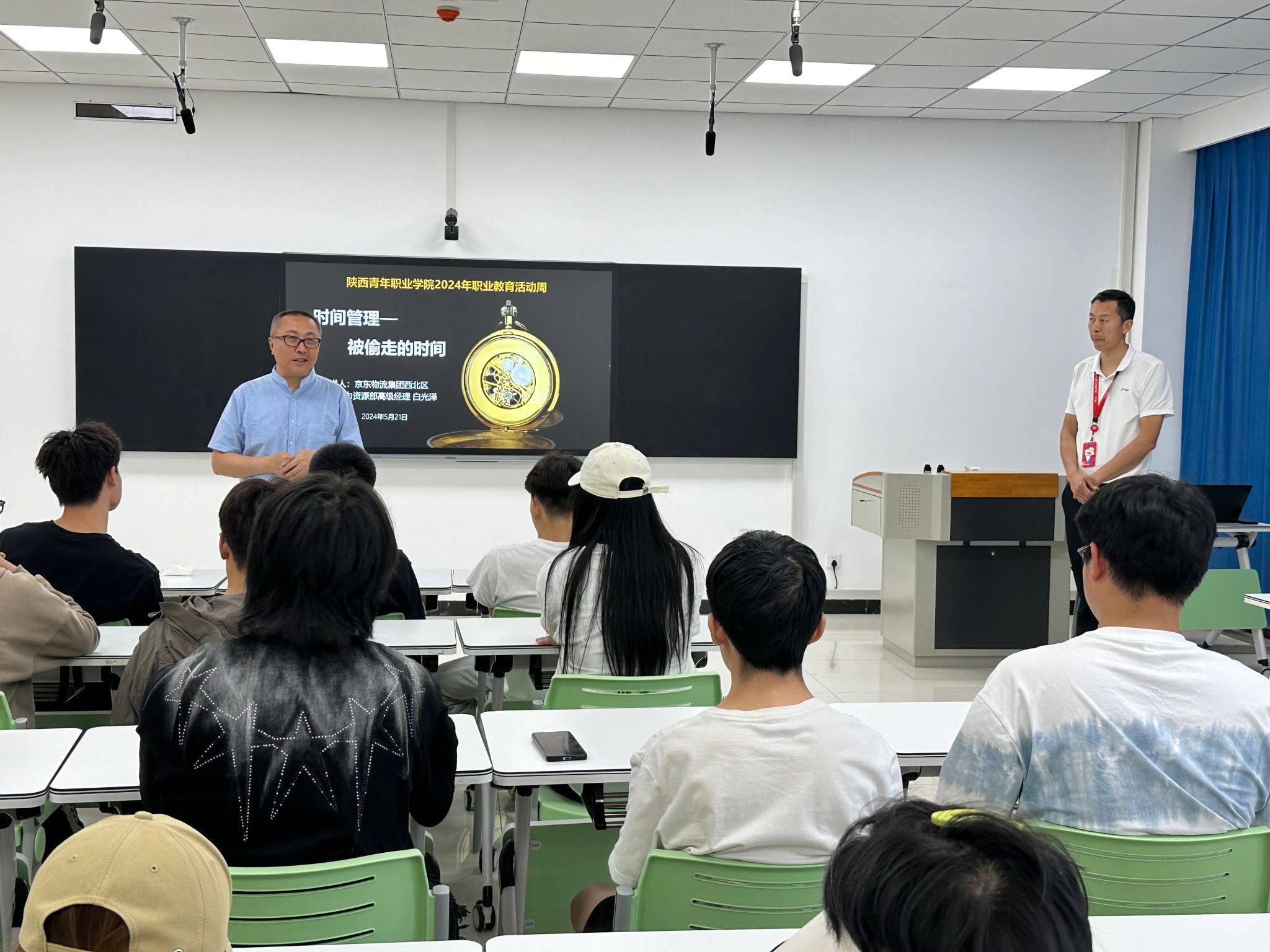 5月21日,交通运营服务系物流教研室举办京东订单班系列讲座—时间管理,京东物流集团西北区人力资源部高级经理白光泽主讲,教务处处长张小卫、交通运营服务系主任韩洲雄、副主任邵华、物流教研室主任张春明、副主任齐卫军以及2023级现代物流管理订单班全体学生参加了活动。