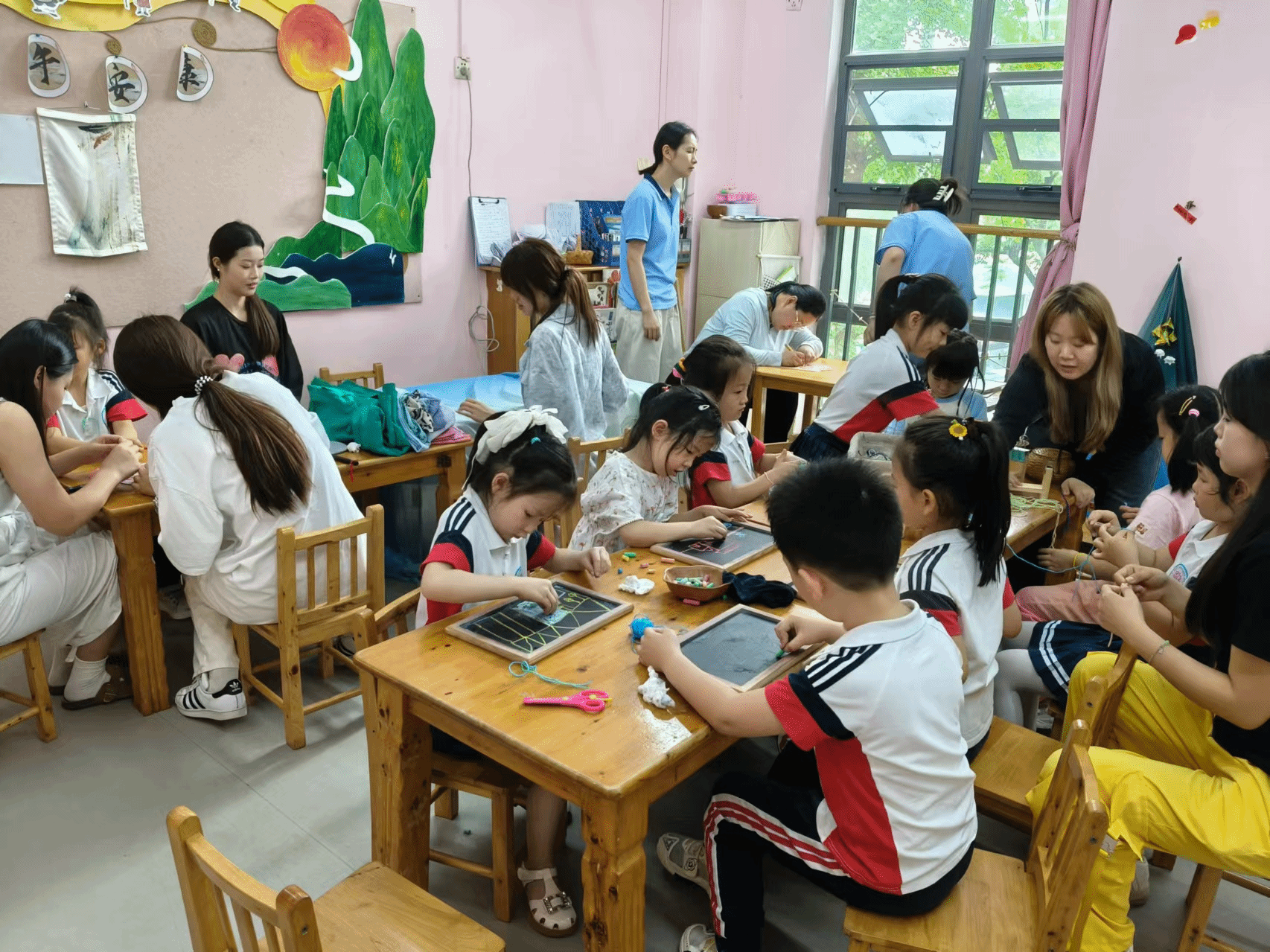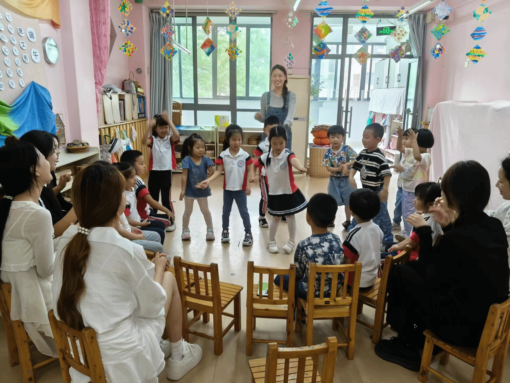 因为坚持华德福教育理念,该园所只有3-5岁混龄设置的苗苗班和大班的果果班,同学们结合学前教育学课程的安排进入不同班级,开展半日活动见习。见习过程中,同学们分组融入班级,全程参与了每个班级的半日保教活动,学生真实感受了幼儿园的晨圈活动、主题活动、区域活动以及“端午安康”主题墙的创设,和孩子们一起制作粽子,参与了幼儿园的体能活动——赛龙舟游戏,并和孩子们同台表演了科目三等小节目。在课后的交流环节,学生们普遍反映教育学理论对于幼儿园保教活动具有实践指导意义,也在活动中真实地体会到学前教育是以游戏为主和保教并重的教育特点。
