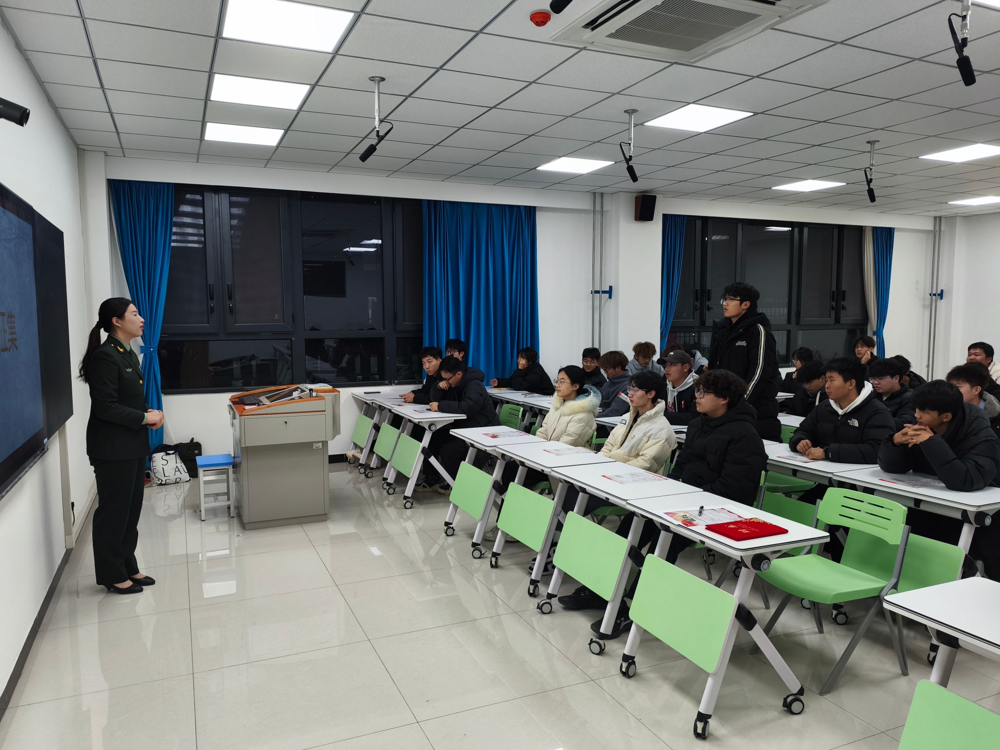 会上,陈晶结合自己5年的从军经历,详细介绍了当前征兵入伍政策的6个新变化、大学生入伍报名流程、基本条件等,其中重点解读了大学生应征入伍特有的专升本、补偿学费、就业创业优惠等优抚政策。随后,在提问环节,陈晶就同学们提出的问题进行了逐一解答,让同学们进一步了解了征兵工作具体要求和军旅生活。