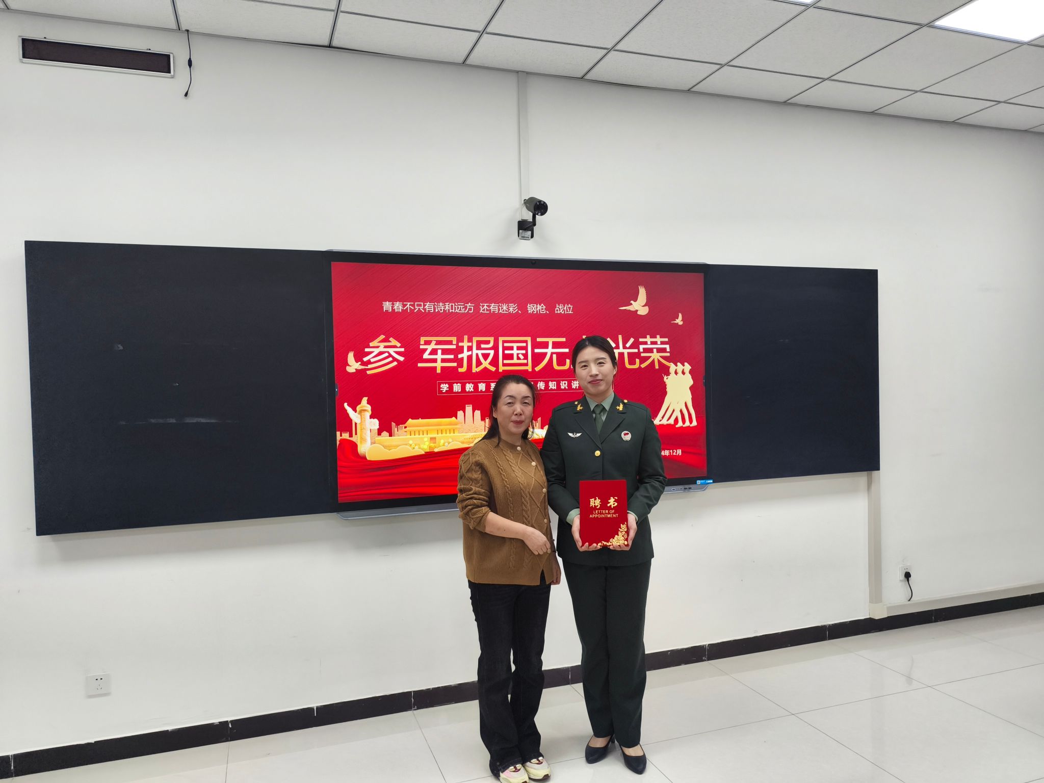最后,卜建丽为陈晶颁发聘书,聘她为学前教育系征兵联络员,并作了总结发言。卜建丽强调了参军入伍对于青年学生个人成长和国家发展之间的重要意义,指出大学生参军入伍既是国家赋予青年的崇高使命,也是青年学子实现自我价值、锤炼意志品质、拓宽职业视野的机会,鼓励同学们积极响应国家号召,踊跃应征入伍,投身绿色军营,为国家的繁荣与安全贡献青春力量。(学前教育系/张燕波 供稿)