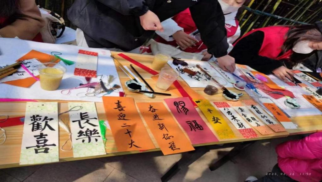 活动现场,余逸兴向参观领导介绍了学院此次志愿服务活动的目的和形式。志愿者们以一幅幅主题鲜明的书画作品,描绘对祖国的美好祝愿、对美好生活的期待。通过现场展示书法、书写书签、绘制团扇赠送给参与市民,以及向市民普及书法相关知识、讲授工笔画与水墨画的区别等带动市民写书法、学绘画,向市民传递党的二十大精神和中华优秀传统文化的魅力。