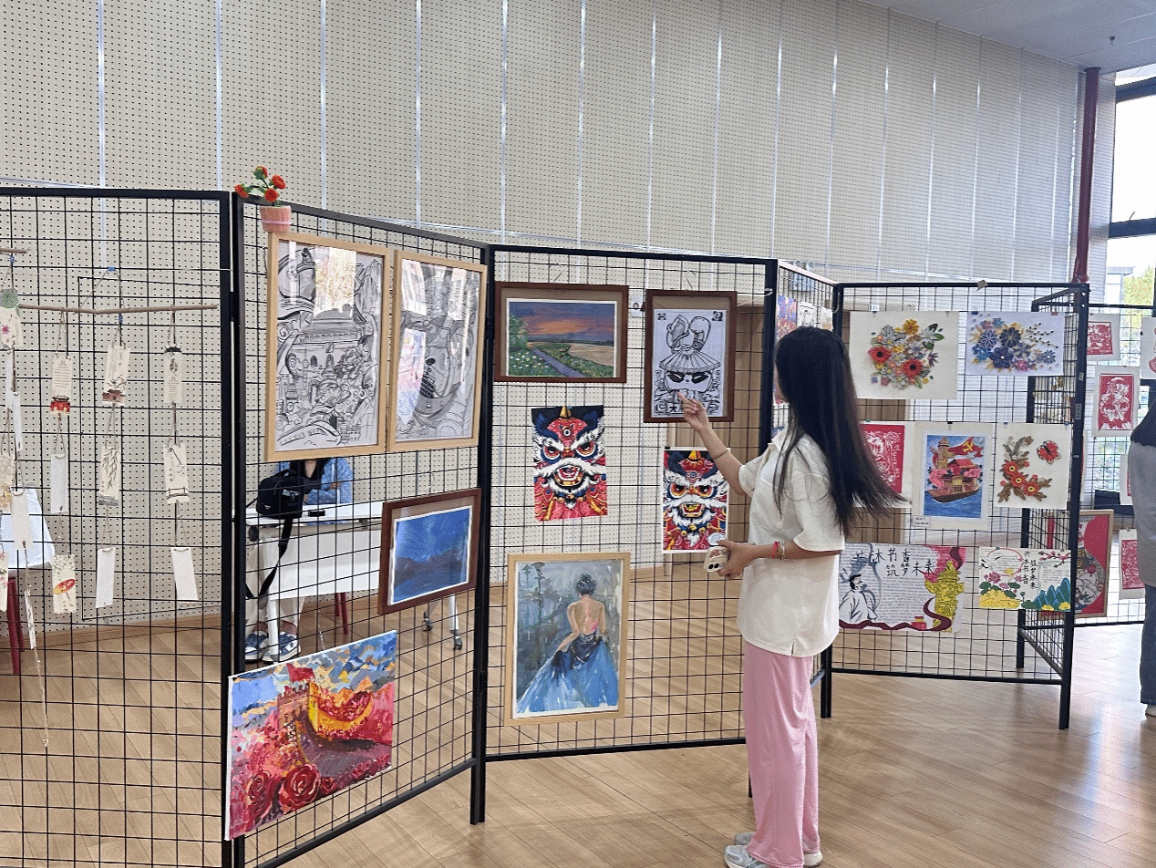 书法、绘画、手工展示——同学们运用笔墨纸砚,将传统书法的精髓展现得淋漓尽致,每一笔、每一划都充满了力量和韵律。绘画作品以不同风格、不同题材、运用色彩和线条,将自然和人文景观描绘得栩栩如生,展现了同学们对世界的独特理解和感受。手工作品将剪纸和衍纸结合,全面地展现中国传统手工艺的魅力和背后的文化内涵和象征意义。
