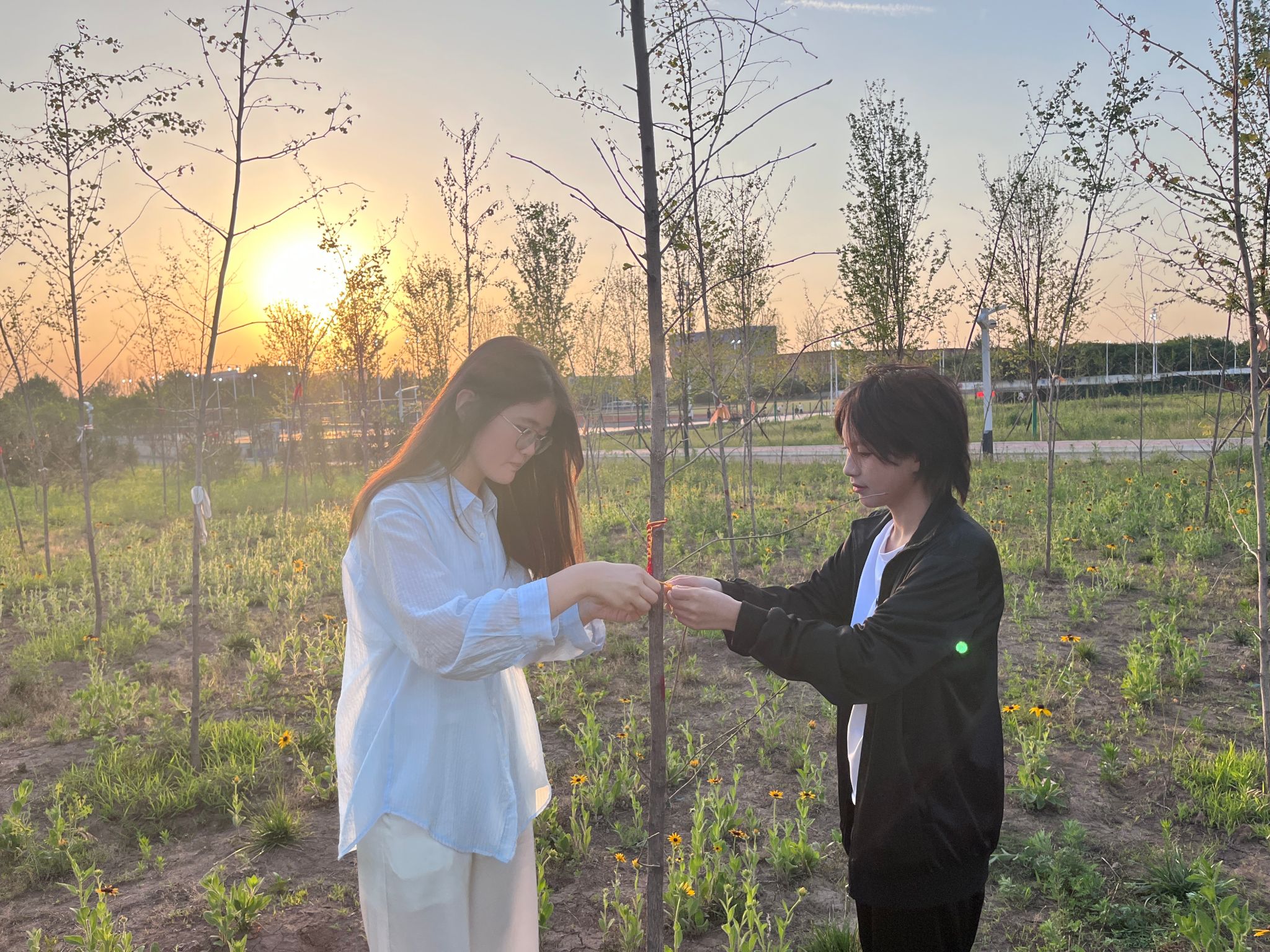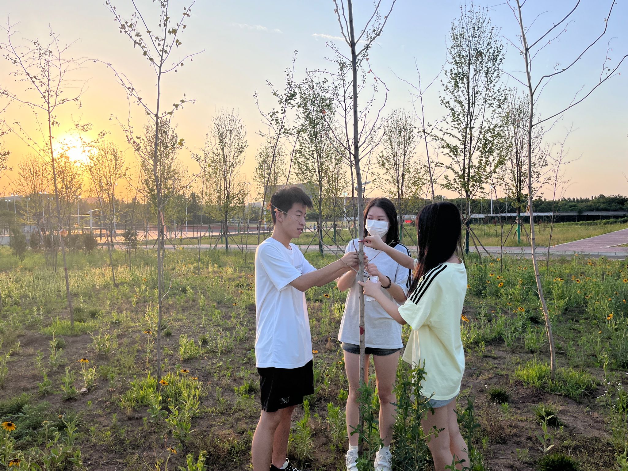 6月6日,在端午节来临之际,继续教育学院学生自发组织编制五彩绳活动,在同学们之间互相赠送,增进同学友谊,并将彩绳系挂在植树节时同学们亲手栽种的小树上,以表达自己与小树共同茁壮成长的美好希望。