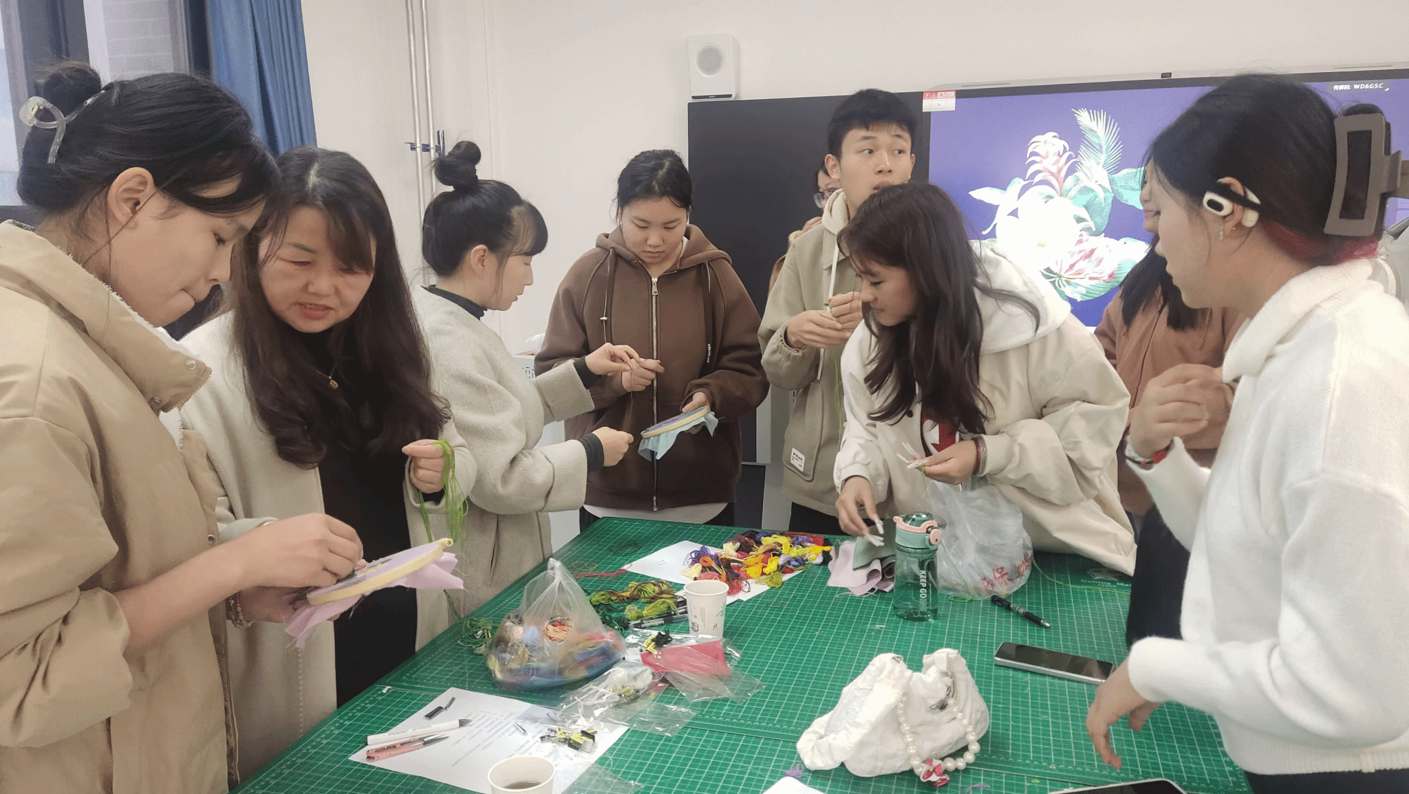 活动中,王秀萍为在场师生讲授了刺绣的文化内涵,详细讲解了本次实践活动的内容。随后,各小组成员领取刺绣工具和材料之后开启了有趣的刺绣实践环节。在王秀萍老师的指导下,五彩的丝线、精巧的绣针在师生手中舞动,大家沉浸其中、全神贯注,最终完成了一幅幅精美的刺绣作品。同学们纷纷表示,原本空白的布在自己手中渐渐有了色彩和图案,还从中深切感受到要想做好一件事情,不能缺少耐心与坚持。