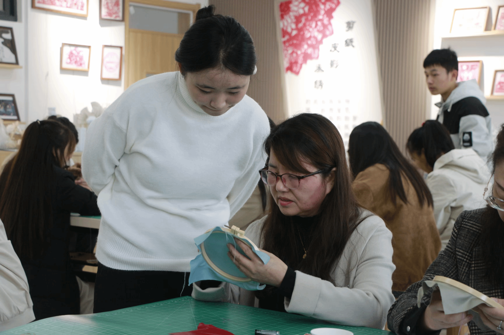11月8日,文化传媒系举办非遗大师进校园系列活动之一“丝缕匠心,秀韵天成”刺绣活动。活动特邀高级工艺美术师王秀萍和绣娘王莹莹指导。文化传媒系党总支书记、副主任王瑜,校团委书记王珊,学生工作负责人唐娜,教学工作负责人杜小峰,专任教师王晓平,非遗薪传社指导老师焦姣及学生代表参加。