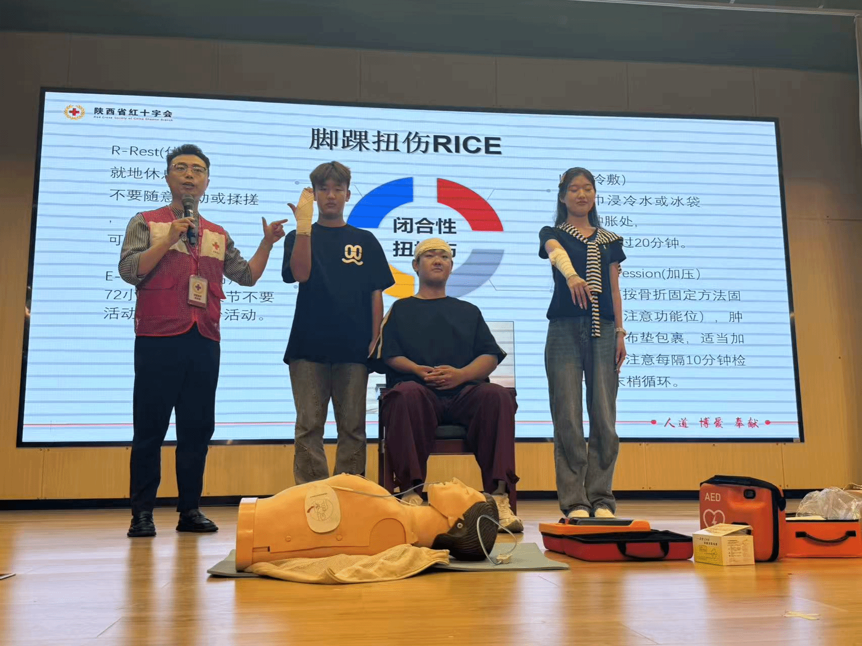 培训开始,王淼详细讲解了成人心肺复苏术(CPR)、自动体外除颤器(AED)的使用方法,气道异物梗阻的正确施救,包扎和创伤救护的方法,并强调了“黄金四分钟”的重要性,提醒大家在遇到紧急情况时要迅速反应、及时施救,以避免不必要的悲剧发生。现场还邀请了几位学生上台进行实操演练,并给予细致的指导和纠正,学生们认真观看,积极提问,现场气氛热烈。