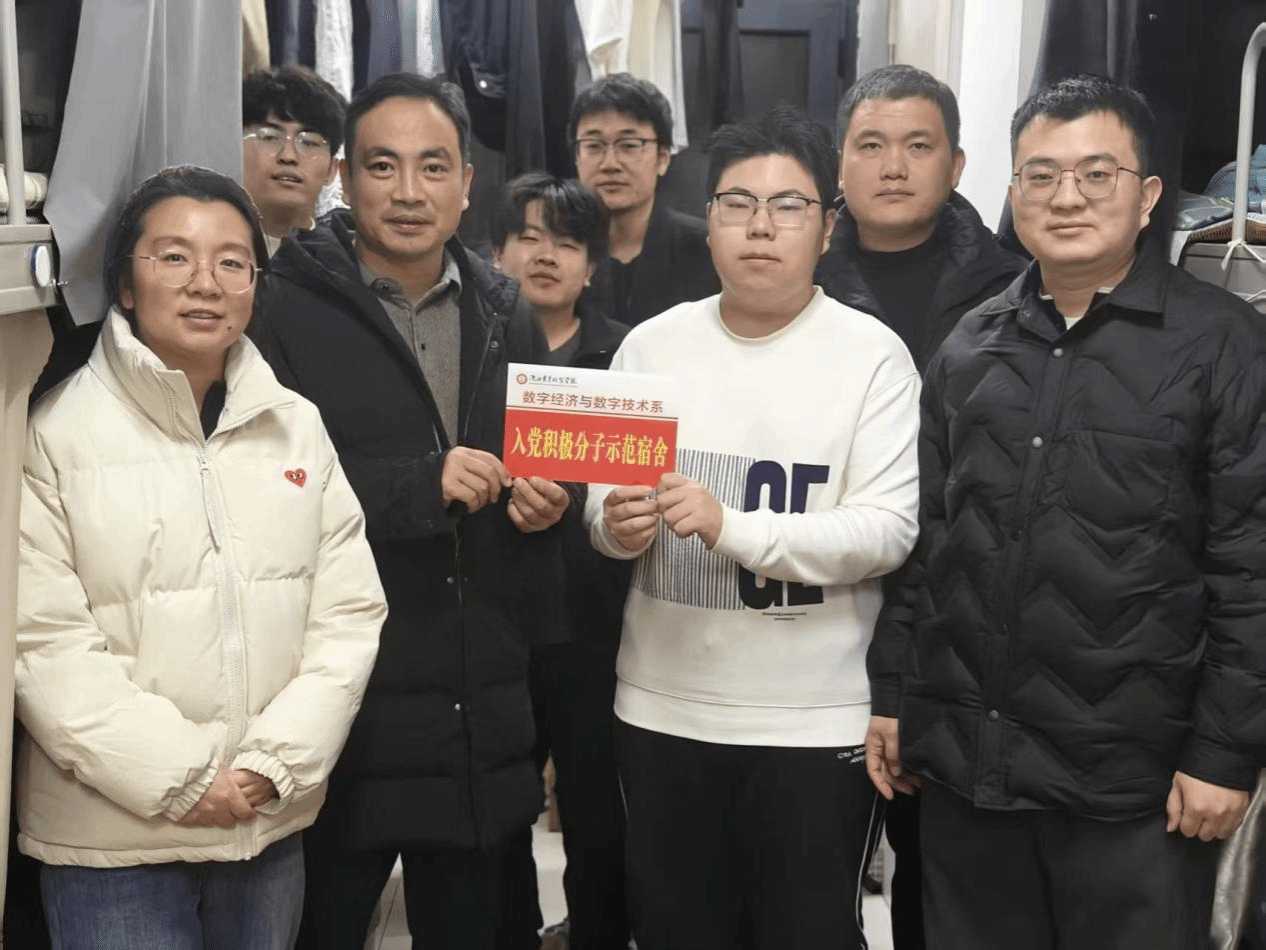 为充分发挥党建引领作用,引导入党积极分子在日常学习生活中主动亮身份、作表率,12月22日,数字经济与数字技术系举行“入党积极分子示范宿舍”挂牌活动。系党总支书记庄绪强、学生工作负责人屈婉聪及全体2024级辅导员深入学生宿舍,现场为示范宿舍挂牌。