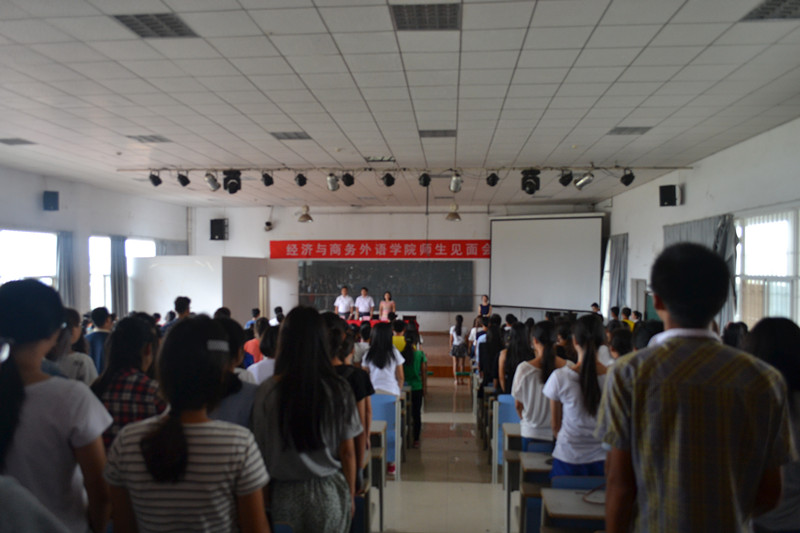经外记者团讯(记者 李波)9月29日上午9时,我院新生见面会于体育馆403会议室圆满召开,院长童光荣教授、常务副院长张晓骏副教授、党总支副书记胡航老师、院长助理徐良培教授、辅导员王强老师、吕琴老师、甘甜老师、夏淑芳老师及各专业优秀骨干教师出席本会。会议在昂扬的《义勇军进行曲》中拉开帷幕。