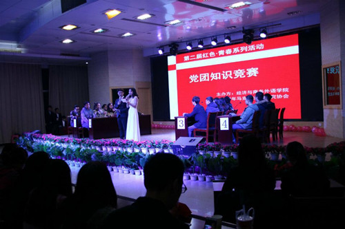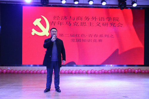 经外记者团讯(记者/摄影 张萧涵 张义军)12月6日晚19时,由经济与商务外语学院青年马克思主义研究会主办的第二届红色·青春系列之党团知识竞赛在体育馆402举行,我院党总支书记胡航老师、分团委书记邹青老师、各专业辅导员、学校及各分团委马研等组织和学生代表参加了此次活动。