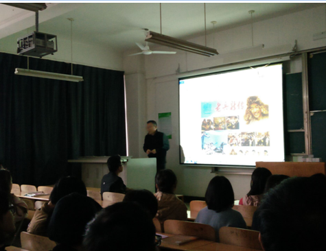 黄献文教授从1895年电影在法国诞生至1905年中国人拍摄自己的第一部电影《定军山》讲起,谈到30年代以上海为中心的中国电影发展和抗战胜利后中国电影的短暂辉煌。之后,黄献文教授向大家重点讲解了新中国成立至文革开始这段时间中国大陆的“十七年电影”。黄教授将“十七年电影”分为了战争片、颂歌片和名著改编电影三部分依次进行讲解,并举例《柳堡的故事》、《草原晨曲》、《五朵金花》和《农奴》的电影片段向大家进行播放展示。在播放展示完《草原晨曲》后,黄教授不禁被那一往无前、改天换地、人生与天的豪迈时代气魄所感染,并与在座同学进行了心得交流。