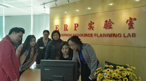 学习考察期间,经济与商务外语学院常务副院长张晓骏副教授、党总支书记胡航书记与广东金融学院金融系实验教学中心主任伍绍平教授围绕创新创业教育、经管类虚拟仿真实验教学体系建设以及大数据云计算技术背景下实验教学资源整合与共享等问题进行深入学习,并在该校实验教学中心主任伍绍平教授及教务处副处长王小燕副教授带领下参观了该校实验教学中心的金融ERP沙盘模拟实验室和ERP实验室。