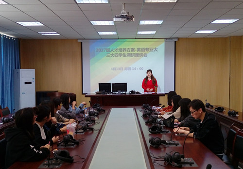 经外记者团讯(通讯稿 武瑞) 4月13日14时10分在我校外语楼220召开了专业外语系2017版人才培养方案调研座谈会。出席本次座谈会的分别有专业外语系主任黄净老师以及15名大三学生代表。