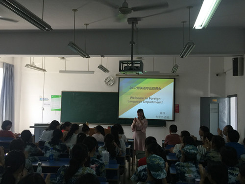 经外记者团讯(通讯员 武瑞)9月14日中午12时30分在外语楼419教室召开了专业外语系2017级新生的宣讲会。参加此次会议的有系主任黄净副教授和专业外语系16名教师及2017级全体新生。