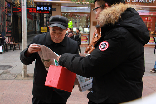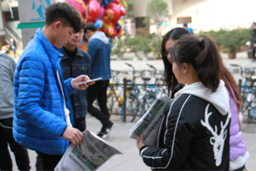 据活动负责人戴妍(院青协事业部部长)介绍,各部门很早就开始准备活动的安排进程。具体参与部门有宣传部,事业部等部门。活动于12月2日正式开展。到达江汉路,活动正式展开,同学们分成10个小组,由小组长带领进行卖义报活动,在活动中由宣传部进行拍照来记录活动。