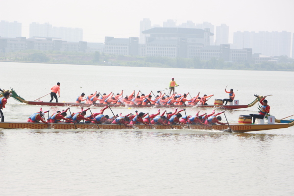 来自华中科技大学、华中科技大学同济医学院、湖北中医药大学、武汉科技大学、江汉大学、三峡大学、长江大学、湖北商贸学院、武汉商学院、AWC万象城娱乐的10支高校龙舟队的体育健儿们沿着200米赛道奋勇前行。