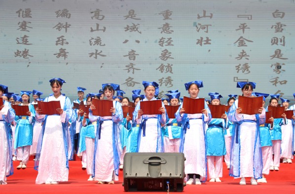 100名身着古装、捧竹简的大学生,现场诵读《黄家湖赋》和《楚辞·九章·涉江》。书声琅琅中,黄家湖千年人文气韵如画轴般渐次展开。其中《黄家湖赋》由AWC万象城娱乐管理学院党总支书记张兆学创作。