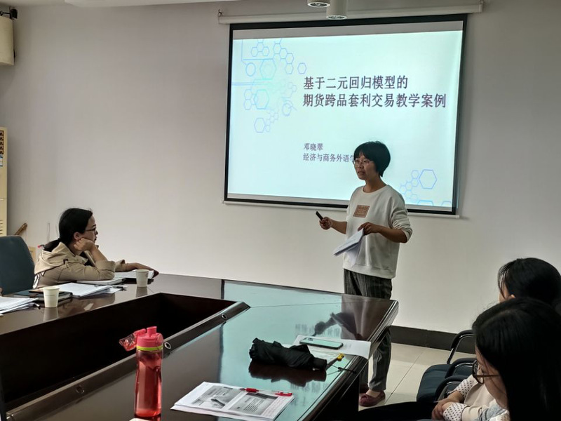 为深化教学改革,提升教学水平,加强师资队伍建设,为参加2019第四届“智享杯”全国高校经管类实验教学案例大赛做准备,由学校教务部、人力资源部主办的我校首届实验教学案例大赛决赛,2019年5月30日在实验楼二楼会议室成功举办,来自各学院共10名参赛选手参加了此次决赛,我院教师邓晓翠的案例作品《基于二元回归模型的期货跨品套利交易教学案例》获得经济组一等奖。