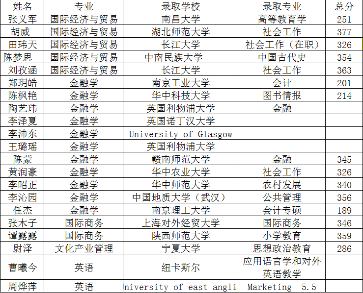 在2019届学生考研中,我院荣获2019届学生考研优秀组织单位荣誉。在良好学习氛围的带动下,我院2019届毕业生在全国硕士研究生统一招生考试中报名人数高达170人,经过不懈的努力与执着的追求,考研的同学们终于收获了丰硕的果实,我院张义军、陈枫艳、张木子、尉泽、周烨萍等21人都考上了自己梦想的大学,金融专业考研率为3.2%; 国际经济与贸易专业考研率为4.3%;国际商务专业考研率为5.1%;文化产业管理专业考研率为3.2%;英语专业考研率为1.7%。有付出才会有收获,我院取得优秀成绩与平时师生的共同努力是离不开的。他们为了考研梦,披星戴月。平日里图书馆座无虚席,学生们都在埋头看书,他们大多是留校备战考研的学生。学校学习氛围好、同学之间可以互相督促让他们选择了留校复习。