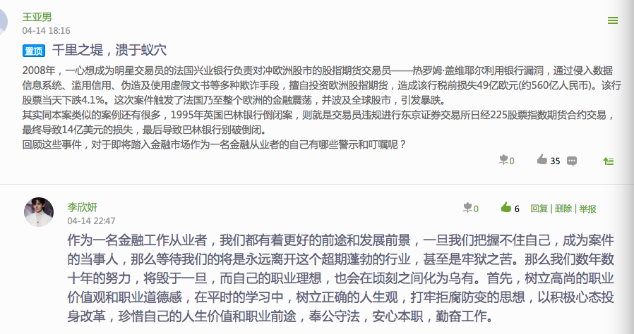 定期我会在教学平台上发起话题讨论,旨在通过话题讨论了解学生学习掌握情况,通过学生的反馈,分析教学是否达到效用。除此之外,话题讨论互动是一种很好的可以将思政教学融合到课程内容的教学方式。比如,在银行业监管着一章,我曾发起过主题为“千里之提,溃于蚁穴”的主题讨论。这个讨论内容是结合国际知名的商业银行违规操作导致严重的经济后果的实例,让学生讨论作为金融从业人员遵守职业操守的重要性,并发问对于即将进入金融职场的自己有什么叮嘱。从讨论结果来看,每个同学都积极参与讨论,并分享了自己内心的真实感受。