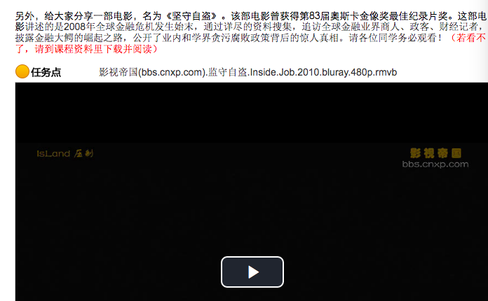 在教学资源上,除了会给学生提供教学视频、课堂小测和章节作业外,我还会搜集网络专业相关资料辅助大家学习,或者是给大家扩充学习。同时给大家不定期更新和推送课程相关内容的时事新闻。在本门课程的第一章节学习中,我通过网络资源下载了一部叫《监守自盗》的奥斯卡得奖纪录片,分享给学生们看。这部电影是以全球金融危机为背景,通过详尽的资料搜集,追访全球金融业界商人、政客、财经记者,披露金融大鳄的崛起之路,公开了业内和学界贪污腐败政治背后的惊人真相。电影真实的披露了当时美国金融监管体系失灵的存在。让学生们在学习之余,还可以通过看电影学习监管知识,了解金融市场真实的工作环境,同时还能达到思政教学的效果。欣慰的是,很多学生反映,虽然这个电影很长但还是会不自觉的一直想看完。