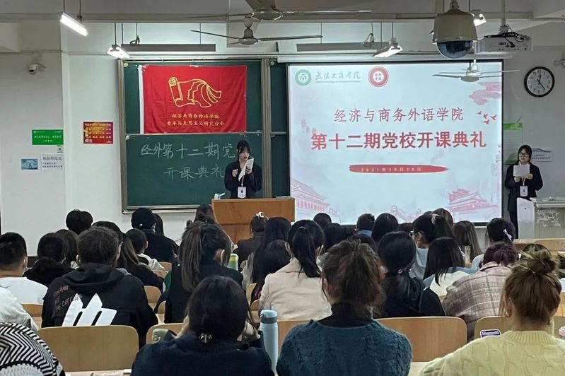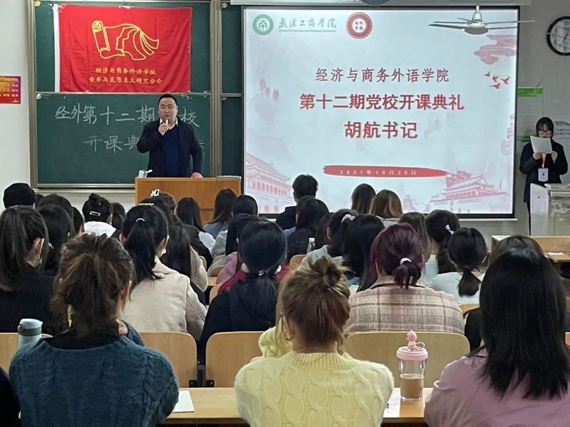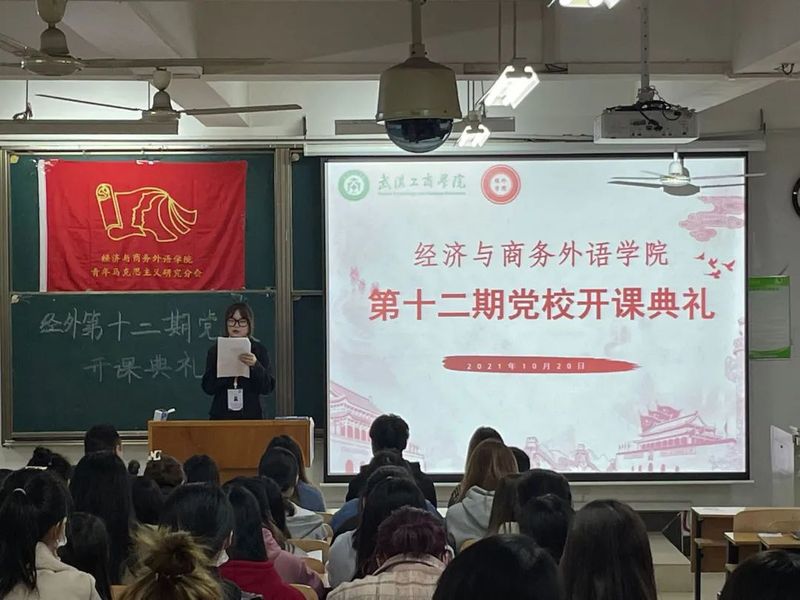 2021年10月20日经济与商务外语学院分团委青年马克思主义研究协会于综合楼207举办了第十二期党校开课典礼”。经济与商务外语学院党总支书记:胡航书记、经济与商务外语学院党校带队老师:杨情老师、第十一届马研主席团、各部门部长以及21级新干事悉数到场。经外马研党建部干事进行点名,党校学习成员举手并答到。