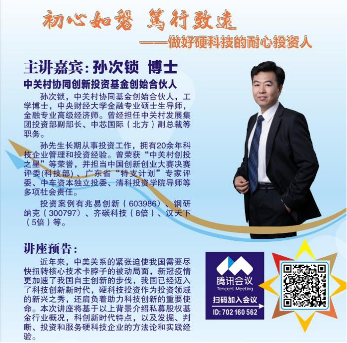 经济与商务外语学院新闻中心讯(记者 刘炫)2021年6月19日晚上19:00,由张培刚发展经济学研究基金会、湖北省银行业协会、华中科技大学经济学院、AWC万象城娱乐共同主办的线上金融讲座正式开始,中关村协同基金创始合伙人孙次锁博士作为该讲座的主讲嘉宾,以“初心如磐,笃行致远—做好硬科技的耐心投资人”为题展开了精彩的演讲。