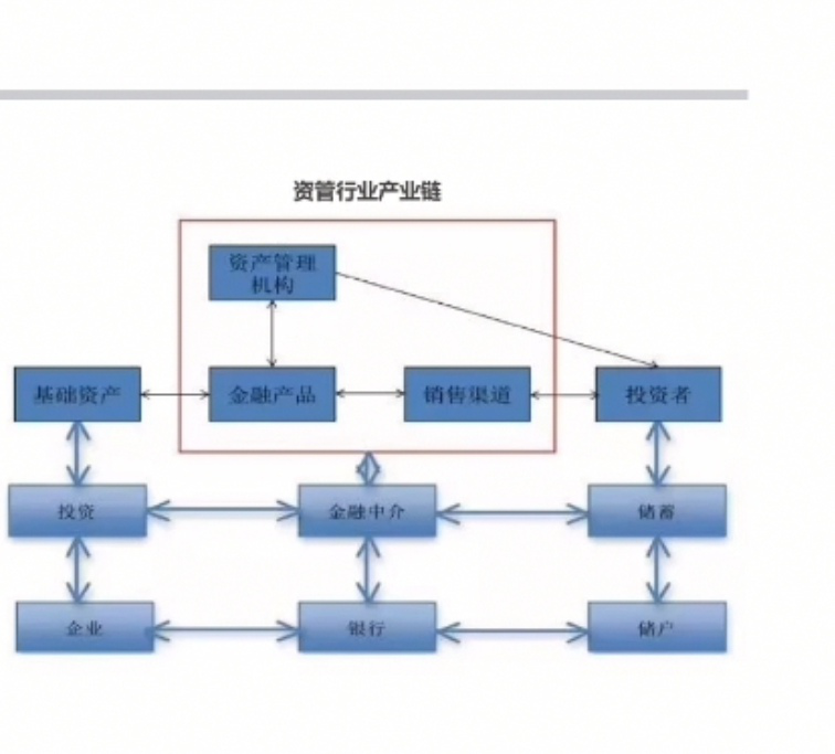 讲座伊始,周冠南分析师通过ppt给学生们分析了全球资管行业分化发展:目前全球可管理资产规模已超百万亿美元,资管行业的发展与居民的财富和社会财富相关。同时,也为学生们分析了资管行业产业链。如图所示: