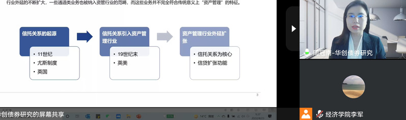 经济与商务外语学院新闻中心讯(记者 刘炫)4月23日上午9:30,特邀华创证券固定收益首席分析师周冠南通过腾讯会议的形式为经济与商务外语学院金融专业的学生讲授以“资产管理行业发展趋势展望”为专题的金融讲座。本次讲座由王红女士主持,华中科技大学经济学院金融系副教授代昀昊担任本场点评嘉宾。