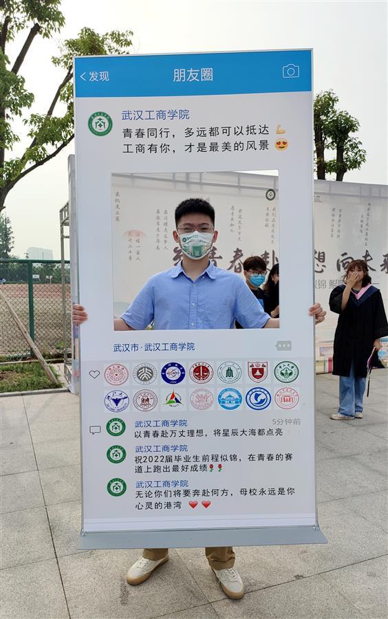 当天,毕业生们纷纷在校园里打卡合影,为大学四年留下美好回忆。“青春同行,多远都可以抵达;工商有你,才是最美的风景。”校园里的打卡框,别出心裁地设计成“朋友圈”及点赞、评论的样式,评论里还印有“以青春赴万丈理想,将星辰大海都点亮”“无论你们将要奔赴何方,母校永远是你心灵的港湾”等。励志话语和温馨祝福,吸引了不少毕业生留影。