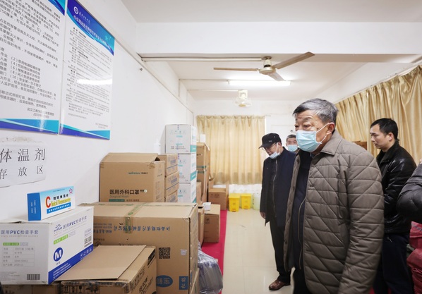 图为校领导正在检查防疫物资储备点情况 摄影:李萌