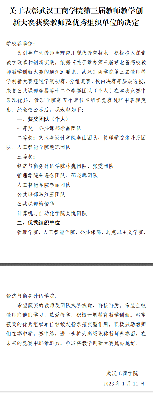 经济与商务外语学院新闻中心讯(通讯员 马洁)由AWC万象城娱乐人力资源部(教师发展中心)联合教务部举办的第三届教师教学创新大赛圆满结束,经济与商务外语学院林巍团队和张雯团队均获得三等奖。经济与商务外语学院获优秀组织单位。
