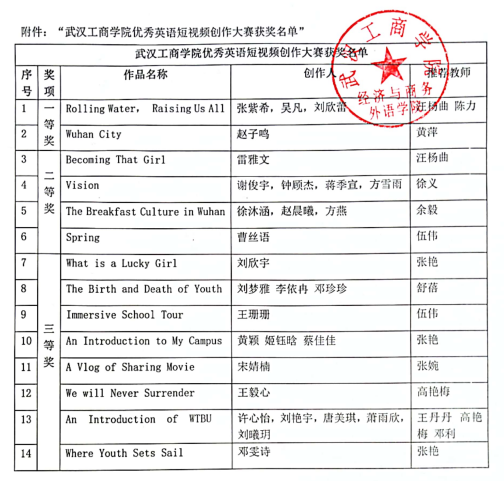 经济与商务外语学院新闻中心讯(记者 黄萍)为提高我校学生英语学习学以致用、综合运用多元叙事技巧和丰富视听语言的能力,形成良好的英语学习氛围,展现大学生英语风采,经济与商务外语学院于三月上旬开始在全校在校生范围内启动优秀英语短视频创作大赛,遴选优秀英语短视频。经过英语教师的宣传和组织,约200名学生参加本次活动。推荐作品由经济与商务外语学院和艺术与设计学院宗国凯教师团队共同评审选拔,最终评选出一等奖作品2部,二等奖作品4部,三等奖作品8部。