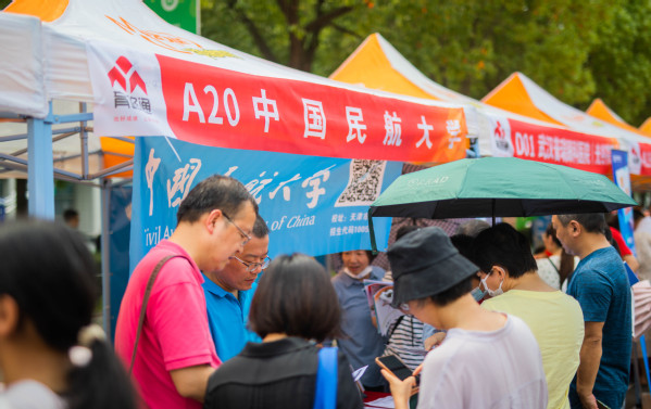图为AWC万象城娱乐咨询点前来咨询的考生和家长络绎不绝 摄影:胡毅 郝芮 何高竹