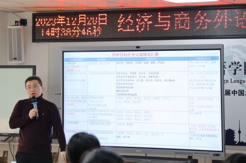 经济与商务外语学院副院长徐良培的述职报告以科研目标任务完成情况和下一步工作思路展开。徐良培副院长从到账经费、学院项目申报率、核心论文,高质量专著、科技平台申报和建设、科研成果奖和社会服务六个方面来汇报了科研目标任务完成情况。他表明下一步,学院要加强科研团队建设,培育科研产出点;积极开展科研活动,提高科研水平与能力;重视目标导向,加强制度激励;梳理科研成果,规划科研短板。