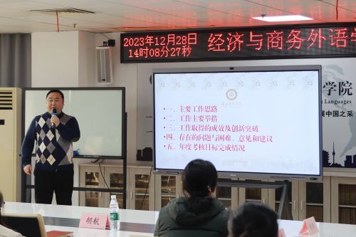 经济与商务外语学院党总支书记胡航从工作主要思路、主要举措、取得的成效及创新突破、存在的问题与困难和年度考核目标完成情况五个方面来进行工作总结。胡航书记表示我院在毕业生就业工作、毕业生考研工作、缴费工作以及政工队伍的科研工作上取得了创新突破。但在招生工作、学院安全和稳定工作上存在一些问题,有待解决。