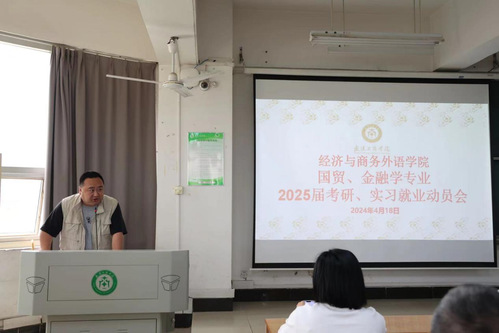 经济与商务外语学院新闻中心讯(记者 谢美仪 摄影 朱睿华)2024年4月18日13:00-14:00,经济与商务外语学院于综合楼507召开国贸、金融学专业2025届考研、实习就业动员大会。本次大会由经济与商务外语学院党总支书记胡航主持。经济与商务外语学院副院长马洁,2021级毕业生指导教师,2020级实习生代表王奎以及2021级国贸、金融学专业全体毕业生出席本次会议。