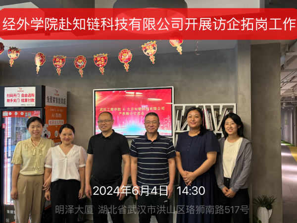 经济与商务外语学院新闻中心讯(记者:诺敏)6月4日经济与商务外语学院副院长徐良培、院长助理吴红艳、金融与保险系主任崔译文及教师蒋彩娜、宝雪,深入知链科技有限公司进行实地走访调研。参加本次交流的有北京知链科技公司湖北区总经理张华炳、湖北知链产教科技有限公司总经理程敬及北京知链科技有限公司解决方案总监、知链新技术赋能教育研究院执行院长周博。