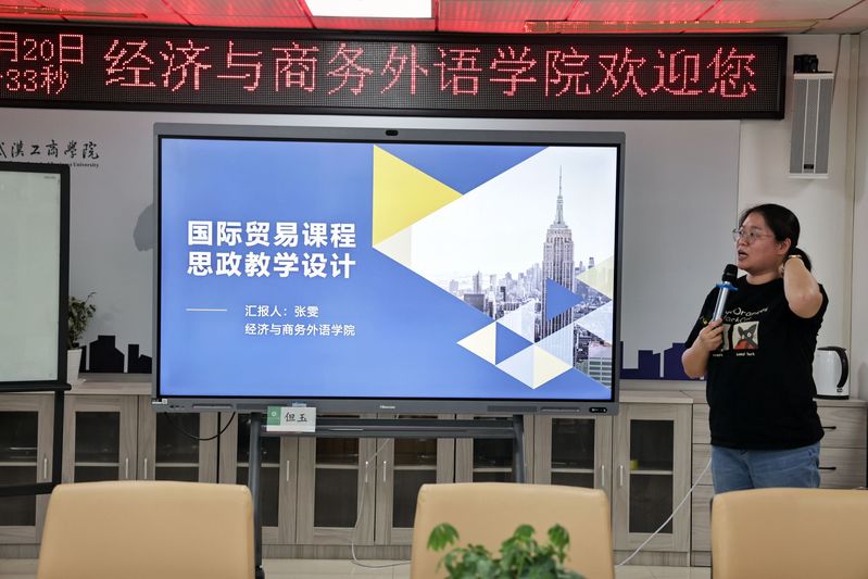 张雯老师主要涉及的是国际贸易课程的思政板块,张老师从课程概况、教学痛点、教学设计、效果反思四个方面介绍了她在授课时的经验。张雯老师在课堂上注重学生的兴趣,采用多种方法调动学生学习的积极性,如使用一些平时学生们会关注到的话题来导入学习的内容,注重学生能力的培养,让学生主动参与到教学活动中。